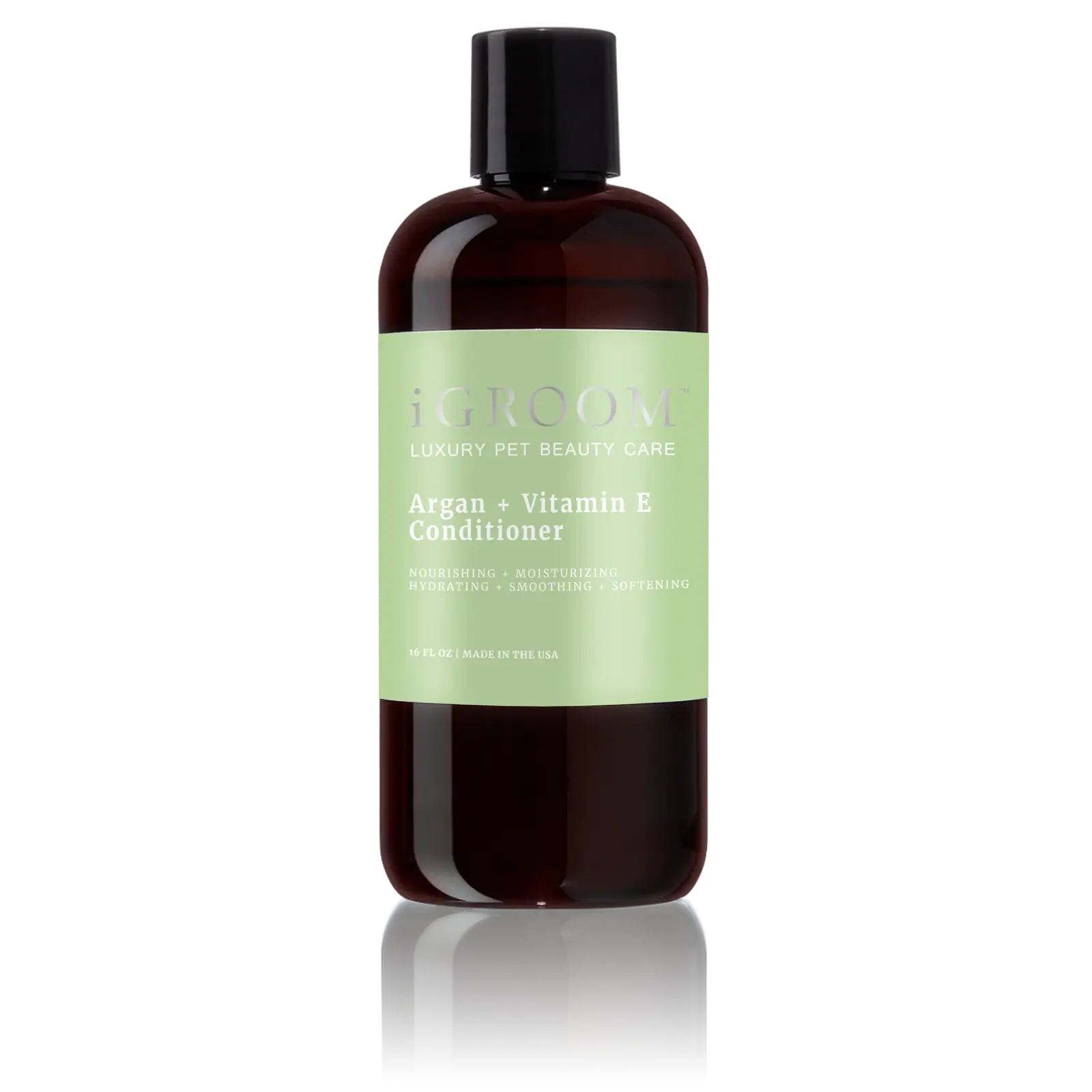Specially formulated with environmentally friendly ingredients, this conditioner protects the hair’s natural elasticity while adding moisture and hydration to the skin and coat. The Argan Oil and Vitamin E extract work together in supporting a healthy coat and skin by strengthening hair follicles and repairing dry and damaged skin. Easy to rinse out, the conditioner leaves the coat silky, soft, and shining without build-up or residue. We suggest pairing this conditioner with the iGroom Argan + Vitamin E Shampoo for maximum results.
