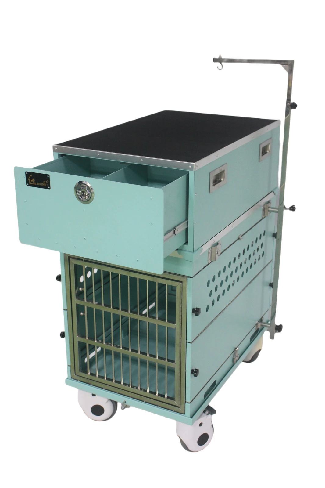 - Securely fits on top of the Solidpet aircraft cage, providing an ideal height and convenient storage with two drawers to keep grooming tools organized.